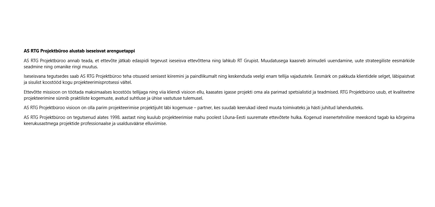 AS RTG Projektbüroo annab teada, et ettevõte jätkab edaspidi tegevust iseseisva ettevõttena ning lahkub Rand & Tuulberg Grupist. Muudatusega kaasneb ärimudeli…